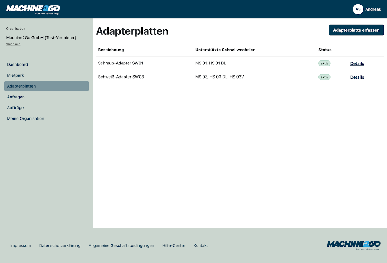 Separat von den Geräten im Mietpark kannst du eine Übersicht deines Bestands von Adapterplatten einsehen.